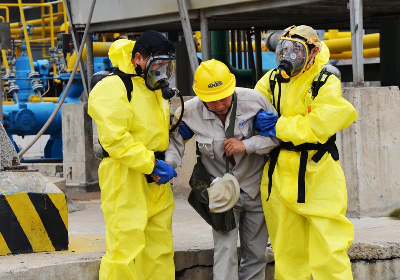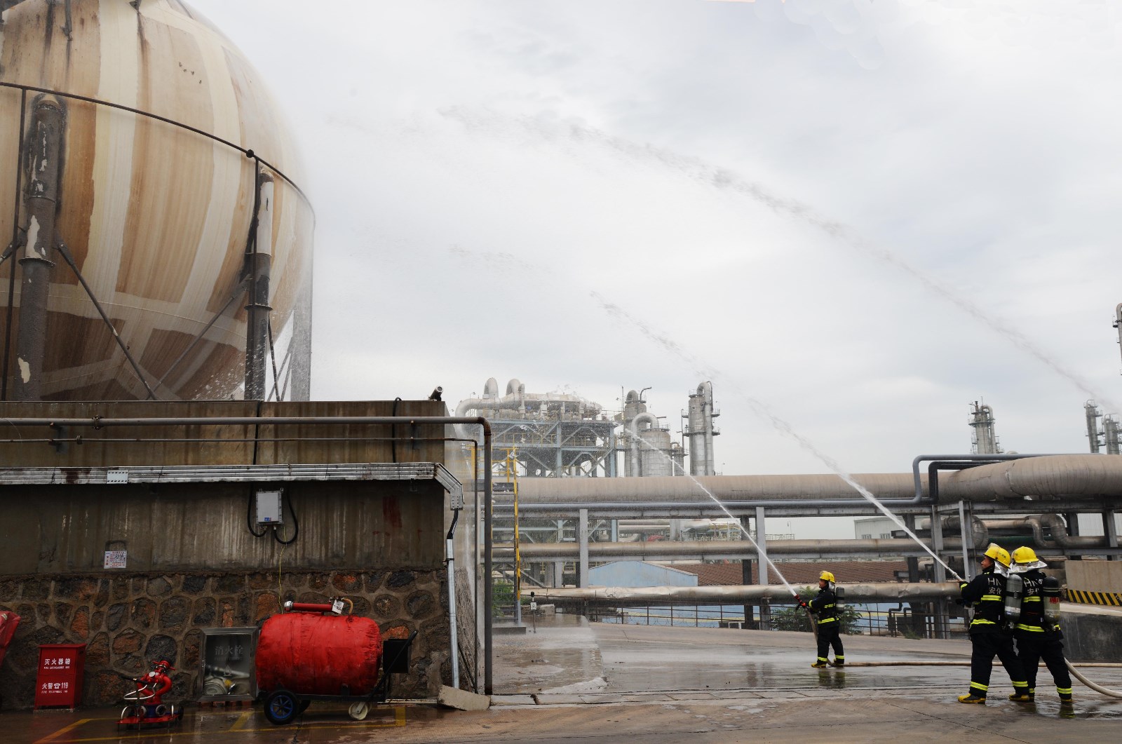 上午九點,參演單位準(zhǔn)備就緒,總指揮徐愛軍宣布演練開始。隨即進(jìn)入演練場景,三甲胺罐區(qū)泄漏,濃煙四起,現(xiàn)場人員出現(xiàn)人員中毒,公司立即啟動應(yīng)急預(yù)案,開展了現(xiàn)場人員自救、公司消防隊支援等多層次、多科目演練。